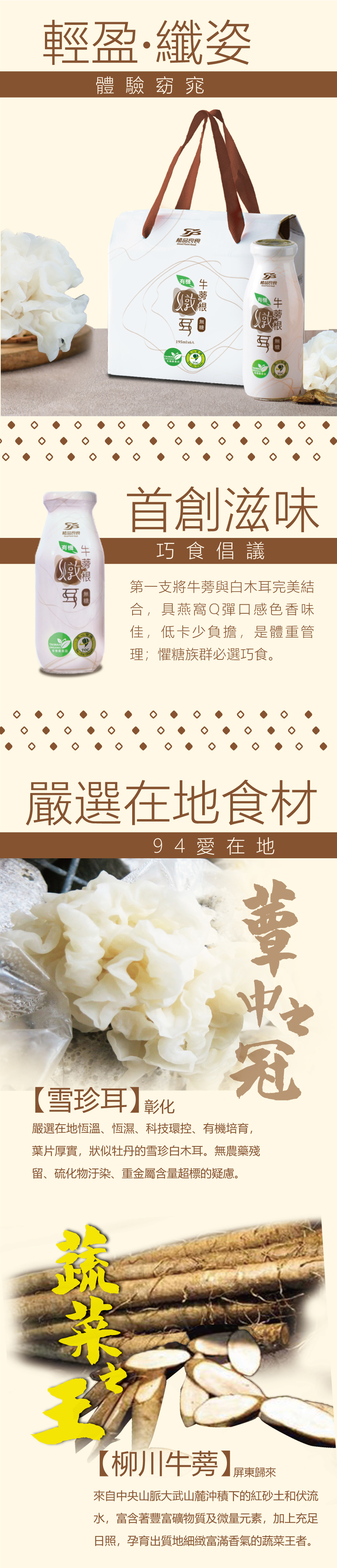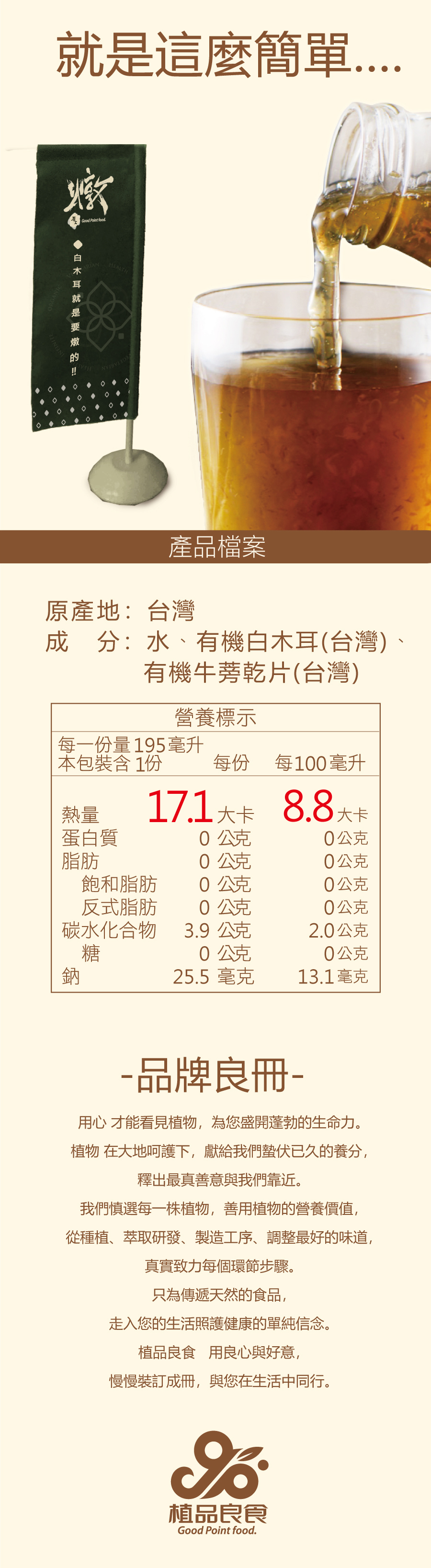 成份:水、有機白木耳(台灣)、有機牛蒡乾片(台灣)